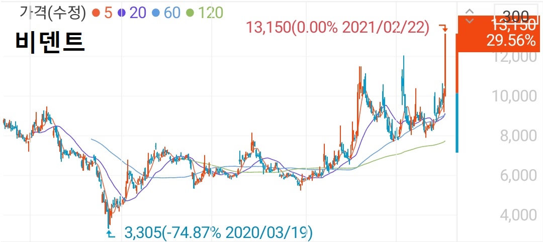 - 2월 22일 2,150원(29.25%) 상승한 9,500원으로 마감