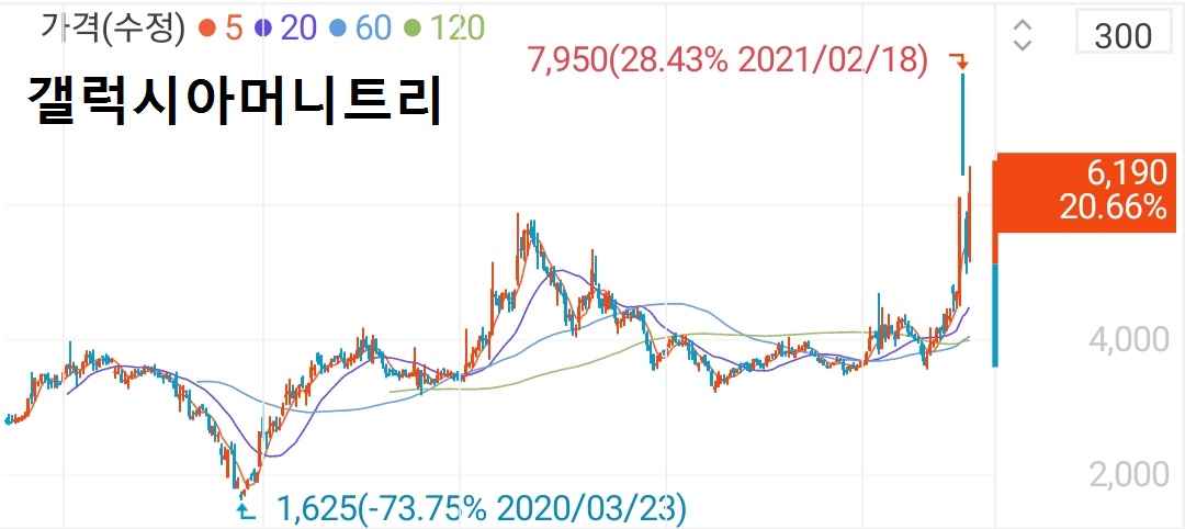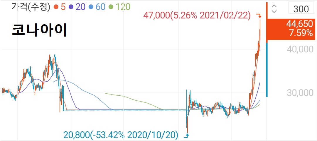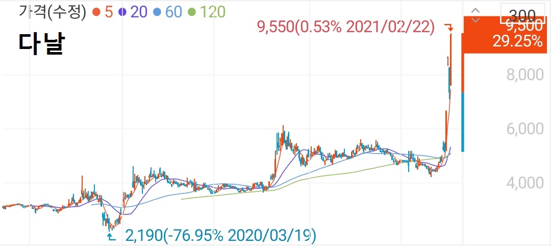- 2월 17일 시가 5,250원 ~ 2월 22일 종가 9,500원
