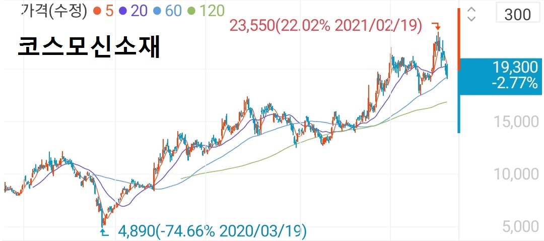 - 21년 3월 2일 종가 19,300원 (2.77% 하락)