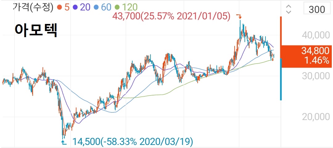- 21년 3월 2일 종가 34,800원 (1.46% 상승)