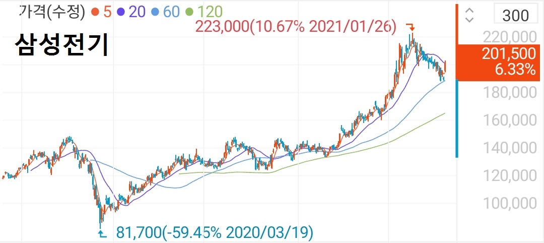 - 21년 3월 2일 종가 201,500원 (6.33% 상승)