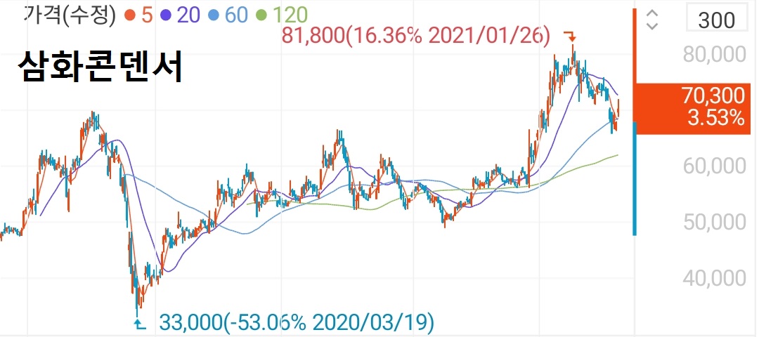 - 21년 3월 2일 종가 70,300 (3.53% 상승)