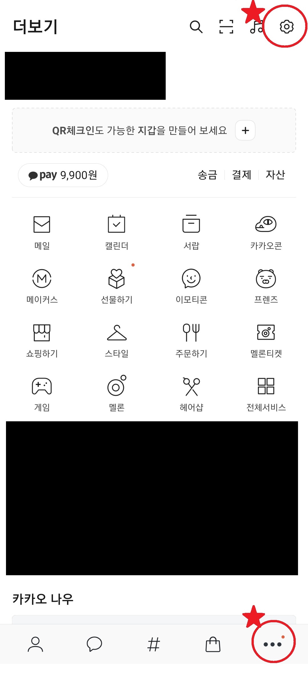 화면 아래 큰 메뉴들 중 제일 오른쪽 땡땡땡 "…"을 눌러준 다음,