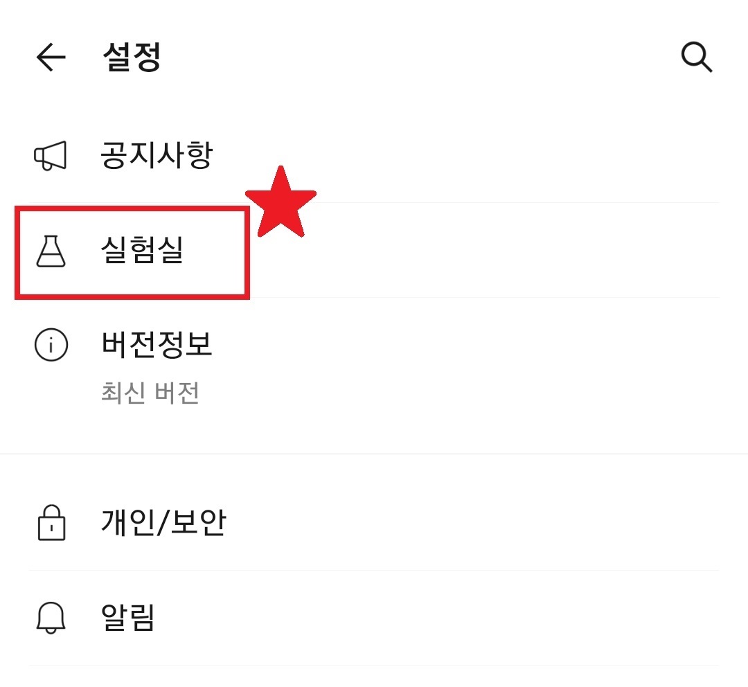 공지사항 밑에 "실험실"이라는 메뉴를 눌러줍니다.