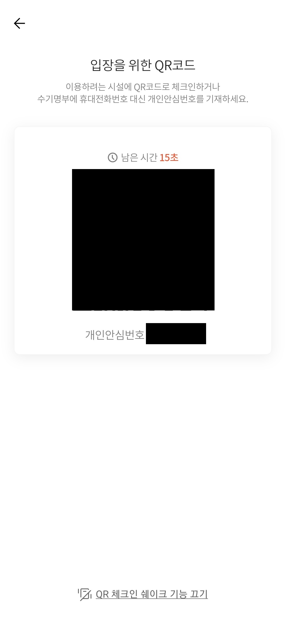 (혹시나 해서 QR코드와 개인 안심번호는 Block 처리했습니다^^)