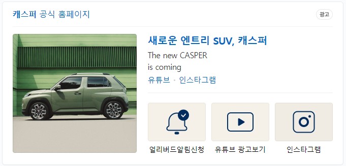 캐스퍼 공식 홈페이지 밑에 The new CASPER is coming 이라는 소개글과 함께 새로운 엔트리 SUV, 캐스퍼가 적혀있네요.