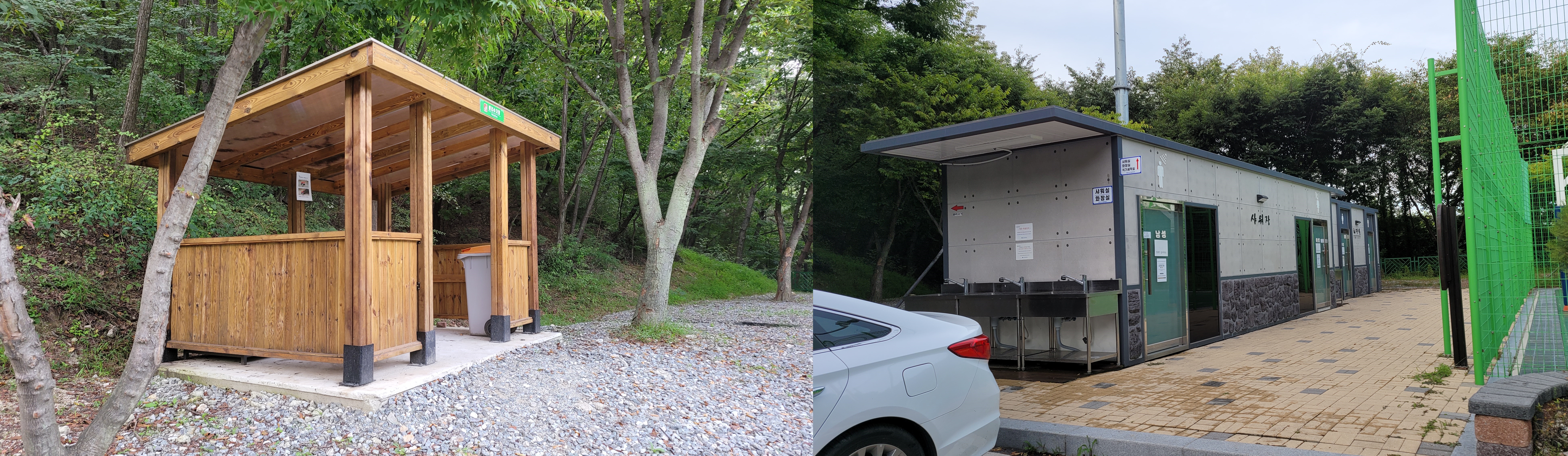 언덕 아래 주차장 왼쪽에는 분리수거장과 샤워장, 세면대(개수대), 화장실이 있습니다.