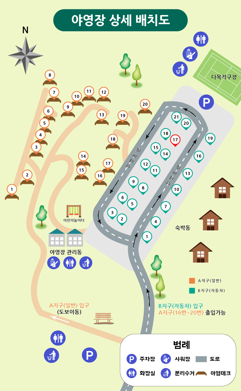 영인산 자연휴양림은 야영장뿐만 아니라 숲 속의 집도 운영 중입니다. 아래 왼쪽의 지도는 전체 휴양림의 배치도이고, 오른쪽 배치도가 야영장의 확대된 배치도입니다. 제가 사용할 B지구 17번 사이트(B-17)가 빨갛게 표현되어 있습니다.