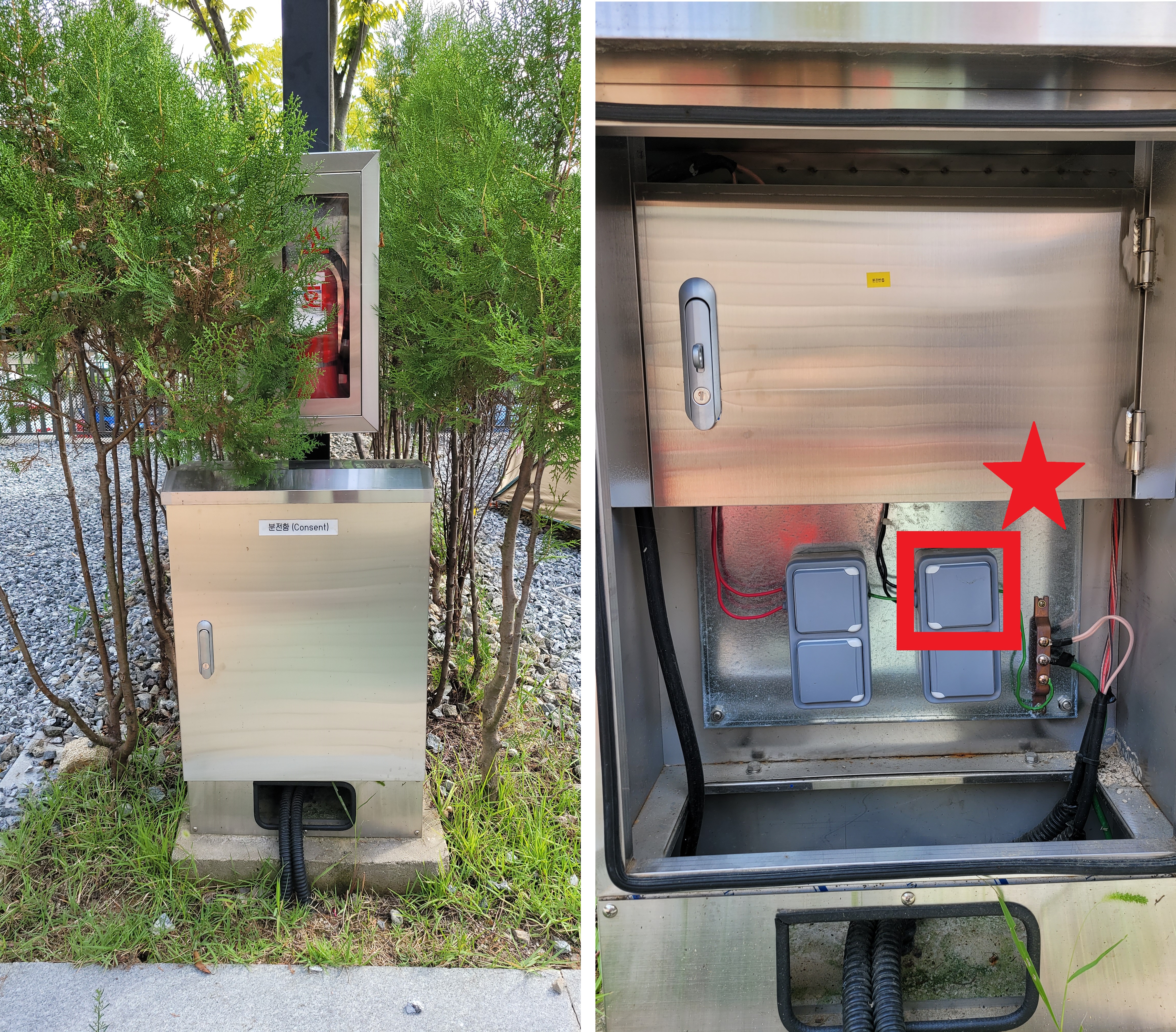 위에는 소화기, 아래에는 배전반이 있습니다. 배전반을 열어보면 총 4개의 콘센트가 있습니다. 빨간 네모로 체크한 부분이 하나의 콘센트입니다. 17번, 18번 양쪽에서 써야 하니 알아서 눈치 있게 저희 사이트와 가까운 2개를 사용하였습니다.