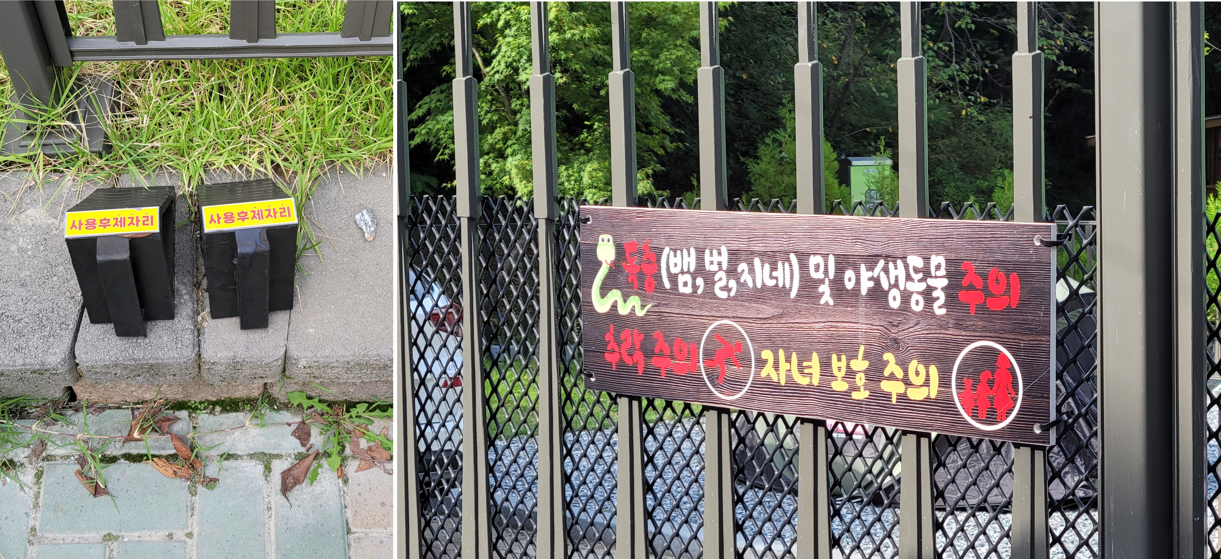 영인산 자연휴양림 야영장의 또 하나의 센스가 있습니다. 오토캠핑장 각 사이트마다 바퀴 고임목이 있었습니다. 아까 말씀드린 것처럼 B지구는 언덕에 위치하고 있는데요, 사고 방지를 위해 자동차 바퀴 고임목이 각각 비치되어 있습니다. 또한 울타리에 각종 독충과 야생동물, 추락 주의 안내를 하고 있었습니다. 세심한 준비라고 생각되는 부분이었습니다.
