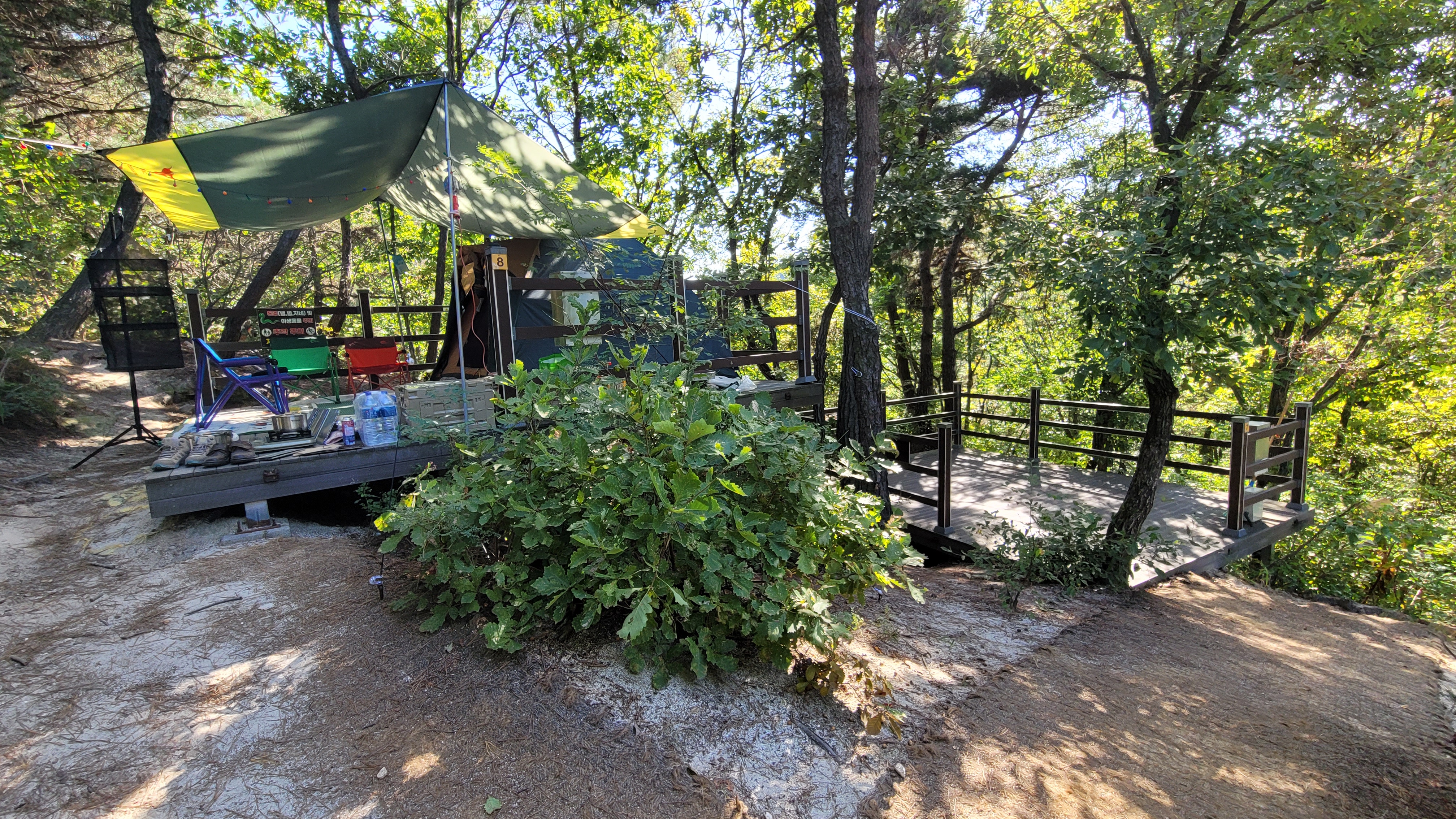 왼쪽이 2번, 오른쪽이 1번 데크입니다. 2번은 길목에 있는 데크로 사람들이 오가면서 노출되는 사이트입니다. 1번은 그런 2번을 지나 올라가면 있는 데크로, 프라이빗함이 특징이나, 짧지만 꽤 가파른 언덕을 올라가야 해서 수레로는 못하지 않을까 싶습니다.