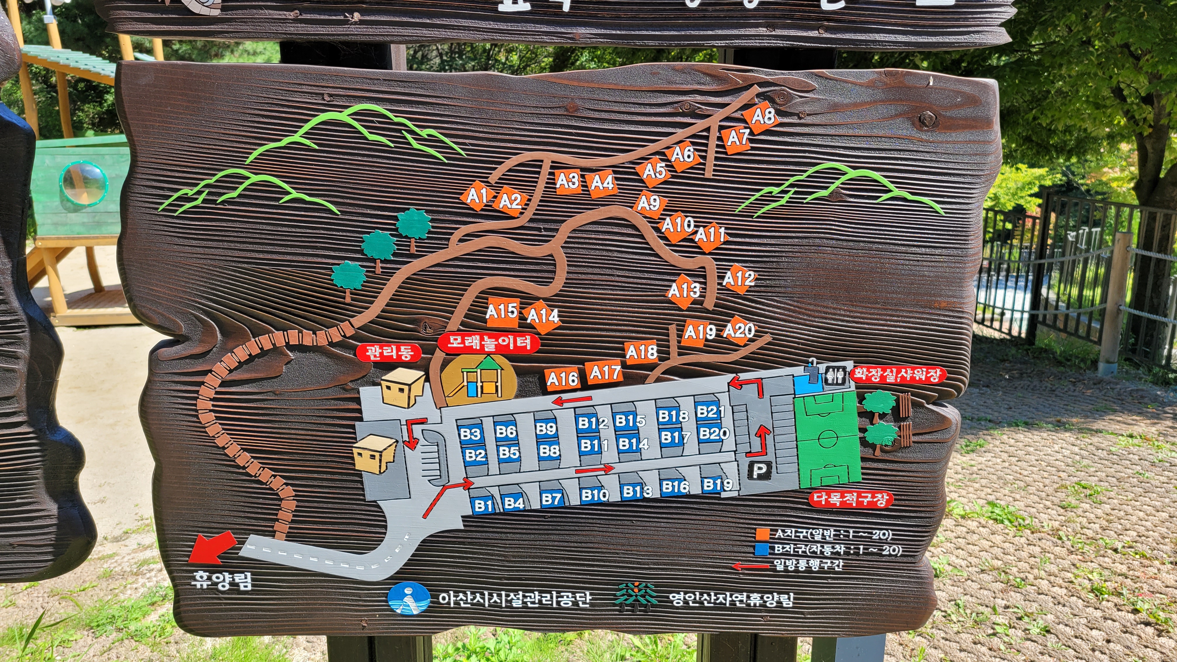 아래 사진 속과 같이 야영장 내 게시되어 있는 배치도입니다. A지구는 숲 언덕 넓은 영역에 분포되어 있습니다. B지구는 보시는 바와 같이 정렬 지어 되어있습니다. B지구는 1번부터 21번 쪽으로 내리막 길인데요, 아래쪽 이용객들을 위한 화장실, 세면대가 있습니다. 다만 위쪽의 관리동 내 화장실, 세면대, 개수대 대비 수가 적습니다. 아래쪽 세면대는 야외에 있는데요, 요즘 같은 코로나 시기에 저는 오히려 밖에 있는 세면대가 더 좋더라고요. 관리동 내 개수대, 세면대는 실내에 있습니다.