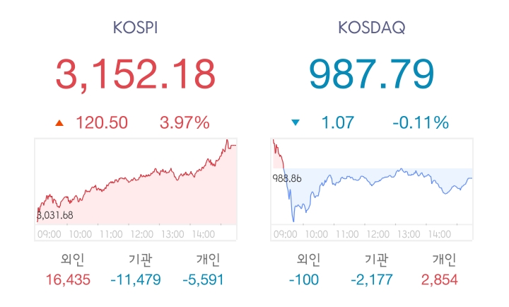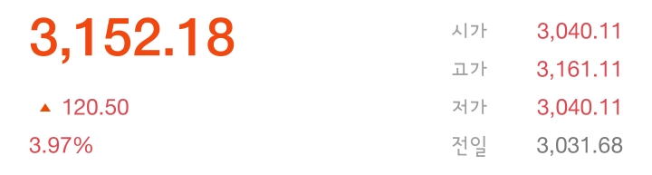 KOSPI는 시가 3,040.11 포인트로 시작하여, 3.97%인 120.50포인트 상승한 3,152.18 포인트로 장 마감 하였습니다. 오늘은 애플카에 대한 애플과 현대차 협업 소식에 자동자 관련주와 자율주행 관련주들이 큰 상승을 했습니다.