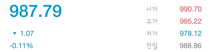 반면 KOSDAQ은 약세였는데, 시가 990.70 포인트로 시작하였으나, 1.07포인트 하락한 987.79 포인트로 마감하였습니다. KOSDAQ도 1000포인트 돌파를 목전에 두고 있으나, KOSPI강세인 근래 시장에서 KOSDAQ도 힘들 낼 수 있을지 지켜봐야 하겠습니다.