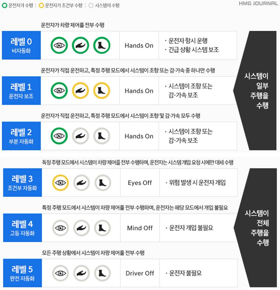 일반적으로 생각하는 자율주행은 운전자가 아무것도 하지 않은 채, 혹은 운전석에 사람이 없음에도 자동차가 알아서 목적지에 가는 것을 상상하는데요, 이미 출시 된 자동차에서 탑재된 스마트크루즈 기능 역시 자율주행에 포함되는 단계라고 합니다. 자율주행 단계는 자율주행시스템이 운전에 얼마나 관여하는지, 운전자가 어떻게 대응하는지에 따라 0부터 5까지 총 6단계로 구분되어져 있습니다. 시스템이 일부 주행을 수행하는 0부터 2단계, 시스템이 전체 주행을 수행하는 3~5단계로 나누어져 있습니다.